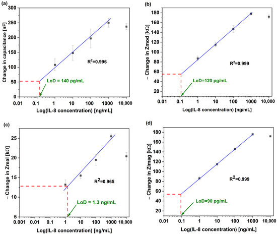 To assess the non-Faradaic sensor’s performance, calibration curves for the capacitance, Zmod, Zreal, and Zimag were plotted, as seen in Figure 3a–d. The data presented cover the linear fit of the data from Figure 2a–d, with an IL-8 concentration ranging from 1 ng/mL to 10,000 ng/mL. The data presented are based on measurements collected at 0.2 Hz. To explore the most sensitive impedimetric parameter of the biosensor, the limit of detection (LoD) for each parameter (capacitance, Zmod, Zreal, and Zimag) was calculated using Equation (1), similar to previous studies [28,36,37]: