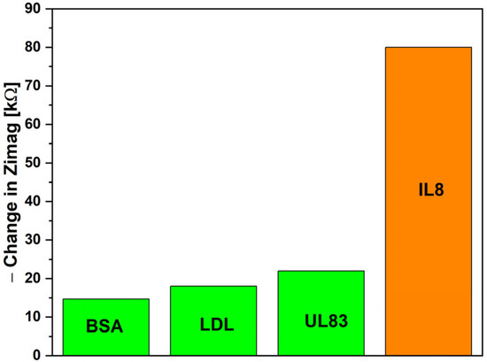 Figure 5 presents the selectivity study conducted in this work. The biosensor was tested with separate samples, each containing 1 ng/mL of a specific antigen: BSA, LDL-antigen, UL83, or IL-8. Zimag was analyzed due to its superior biosensing performance. The observed changes in Zimag were 14, 17, 22, and 79 kΩ for BSA, LDL-antigen, UL83, and IL-8, respectively. These results highlight the biosensor’s exceptional selectivity for IL-8 antigens.