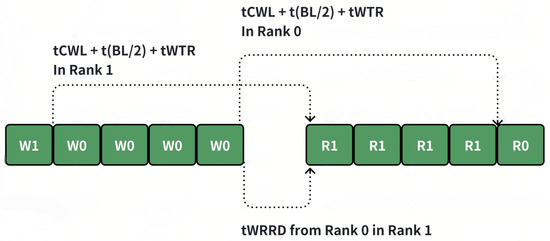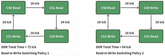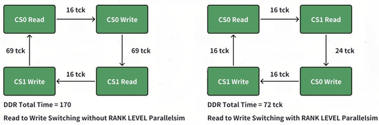 DDR3 does not offer the rank-level switching timing, which could take advantage of the rank-level switching [23,24]. But as LPDDR5, which is the latest DRAM type, this type provides identical constraints to the rank-level timing. Thus, we further calculate the timing difference of it and timing control arbiter difference.
