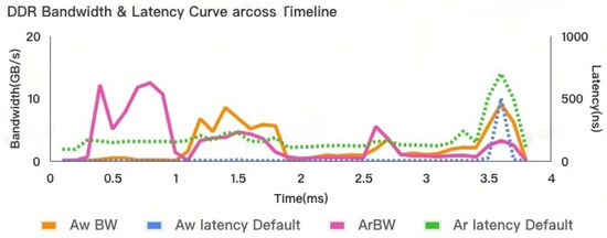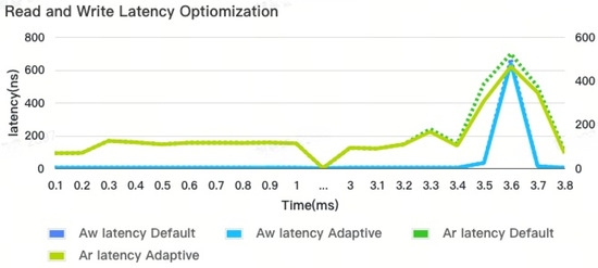 In this section, we compare the rank-level read/write turnaround architecture with an adaptive control arbiter (ADCO) from a performance perspective. The work adopted in this article can be orthogonally and seamlessly embedded into the original read–write switching logic together with most of the read–write switching schemes available on the market. We compare the ADCO with the previous fixed rank-level arbitration method (FRAL). From the figure below, we can see that the bandwidth requirement and average latency results vary along the timeline. Compared with Figure 8, it follows the DDR dynamic latency curve. As the bandwidth requirement increases, the latency consumed also increases.
