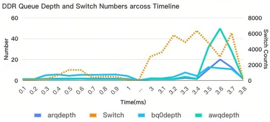 This large bandwidth requirement further increases many read/write turnarounds. The details of the AQ and BQ depths in Figure 9 represent the internal loading details of the DDR controller. The depths of AQ and BQ can also offer insights into this trend. However, the increase in latency difference is not directly proportional to the increase in bandwidth. The relationship between the two is not consistent or in the same ratio.