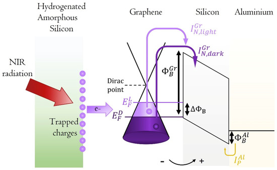 Band diagram of the Gr/c-Si/Al metal semiconductor metal junction in flat-band conditions [35]. The Gr is capped with the a-Si:H. Under NIR light irradiating the trap states at the a-Si:H/Gr interface, electrons are released in the Gr increasing the Fermi level from (Fermi level in dark) to (Fermi level upon illumination). Consequently, a higher thermionic current flows in the device because of the smaller Gr/c-Si Schottky barrier [15,32]. represents the Fermi level shift upon NIR illumination while the hole current flowing through the Al/c-Si Schottky junction .