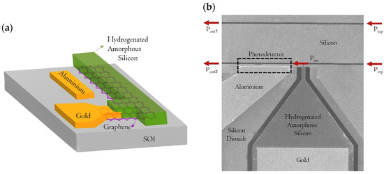 Figure 2a offers a detailed visualization of the active device, highlighting the aluminum (Al) electrode and the SLG positioned on c-Si. The junction formed by SLG/c-Si/Al represents a metal-semiconductor-metal (MSM) structure [35], with its associated energy band diagram illustrated in Figure 1. The a-Si:H layer plays a crucial role in this system due to its refractive index being closely aligned with that of c-Si, effectively minimizing optical discontinuities for the propagating infrared light.