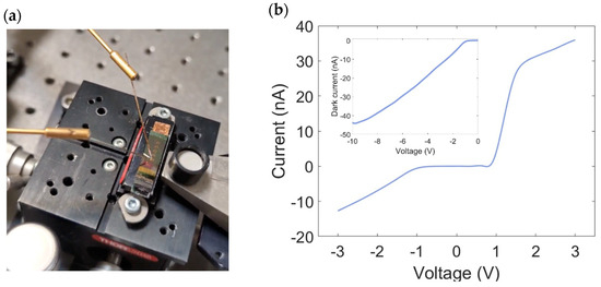 The electrical performance of the devices was evaluated using a probe station paired with a source meter (Keithley Instrument Inc., Cleveland, OH, USA). Electrical contact was achieved using two precision metal probes, which were carefully placed on the device mounted on the probe station holder, as displayed in Figure 3a. These probes were attached to micromanipulators, securely fixed to the optical table via a vacuum system.