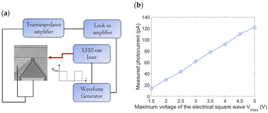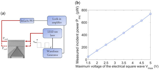 The experimental setup, illustrated in Figure 4a, is relatively straightforward. A continuous-wave 1310 nm laser source (Thorlabs, Milan, Italy) is modulated at 270 Hz using an external waveform generator producing an electrical square wave. Light is coupled into the waveguide via a tapered optical fiber, while the output light is collected by a multimode optical fiber with a core diameter of approximately 70 μm. The collected light is then converted into an electrical current by a calibrated InGaAs PD, and is subsequently analyzed using a lock-in amplifier.