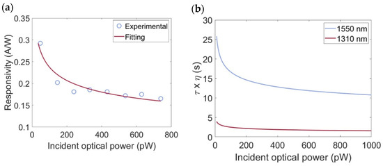 (a) Responsivity of the SPARK effect-based PD at 1310 nm as a function of incident optical power, with the corresponding curve fit (red) based on Equation (6). (b) Dependence of the efficiency-lifetime carrier product on incident optical power at 1310 nm (red curve) and 1550 nm (blue curve).