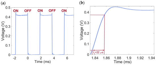 (a) Real-time voltage generation of the photodiode (PD) under 1310 nm-light exposure. (b) Rising part of the real-time photocurrent response, showing a rise time of 22 μs.