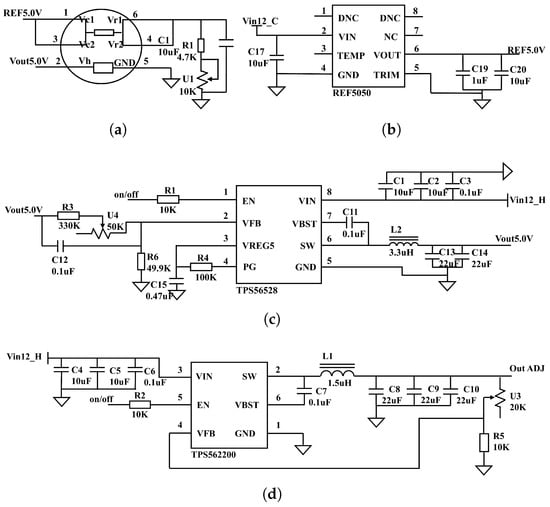 (a) Sensor peripheral circuit; (b) reference power supply circuit; (c) 5 V switching power supply circuit; (d) adjustable switching power supply circuit.