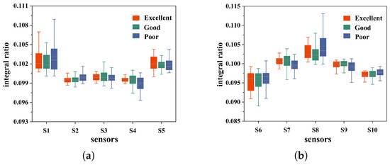 (a) Sensor 1–5 response data box plot. (b) Sensor 6–10 response data box plot.