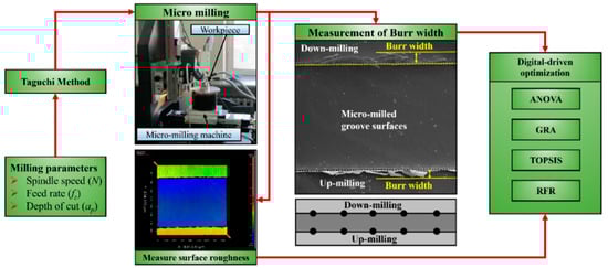 Considerable efforts have been dedicated to investigating the formation mechanism of milling burrs in titanium alloy processing [15,16]. Numerous three-dimensional finite element models (FEMs) have been constructed to simulate the micro-milling process of the Ti-6Al-4V titanium alloy [17,18]. These models have provided insights into the impact of tool geometry, blunt circle radius of the tool cutting edge, as well as the coating, on the process of burr formation and the resulting burr sizes. Through FEM simulation and experimental analysis, Chen [11] systematically classified the types of burrs occurring in the microgroove milling process of Ti-6Al-4V and reported that the size of milling burrs generated on the up-milling side is much larger than that on the down-milling side. Recently, with the development of digital-driven artificial intelligence (AI) technologies [19,20], a lot of digital-driven analysis methods have been adopted to optimize the machining surface quality and reduce the burr sizes, like multi-objective optimization, grey correlation analysis (GRA), and particle swarm algorithm [15,21]. These methods have their respective pros and cons. Meanwhile, hybrid AI approaches, integrating some of the abovementioned methods are gradually showing their powerful capacities to reveal the relationship between processing factors and machining responses [22,23].