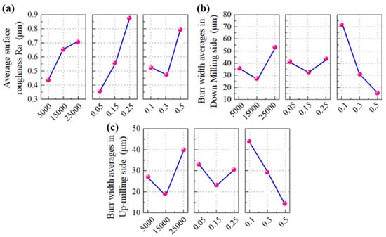 Main effect plot of ANOVA for (a) Ra; (b) burr width generated in down-milling mode; (c) burr width generated in up-milling mode.