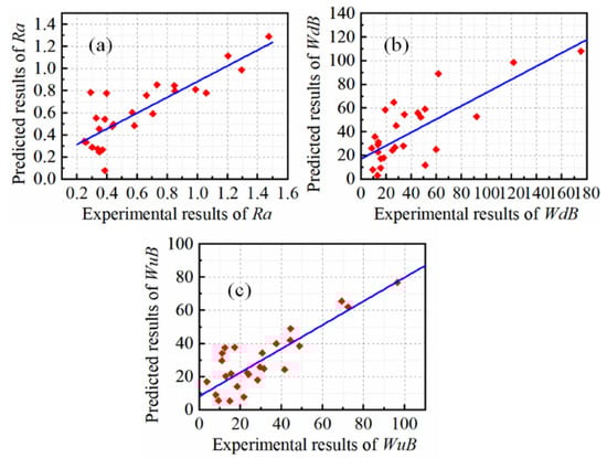 Initially, linear regression models were built for predicting the surface roughness (Ra), burr widths on the down-milling side (WdB), and burr widths on the up-milling side (WuB), as expressed in Equations (10)–(12). In addition, the R2 value for these three models is 0.7009, 0.5591, and 0.7164, respectively. Figure 4 shows the concordance between the experimental data, as listed in Table 2, and the predicted data by the proposed models (Equations (10)–(12)).