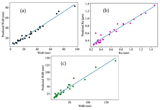 To improve upon the prediction accuracy, a random forest regression (RFR) model is adopted due to its interpretability, robustness, and strong predictive performance in manufacturing contexts compared to the Support Vector Regression (SVR) and Artificial Neural Networks (ANNs). The variations in the actual versus RFR-predicted responses are shown in Figure 5. It can be seen that the prediction accuracy of the RFR model is significantly better with R2 values of 0.93, 0.93, and 0.96 for the responses Ra, WdB, and WuB, respectively. The RFR model’s ability to capture nonlinearity, handle feature interactions, robustness to outliers, ability to handle non-numerical features, and feature selection mechanisms collectively contribute to its superior performance. This is specifically true during the modelling of complex process mechanisms like micro-milling. More in-depth error analyses, such as RMSE and MAE, could be further explored if needed.