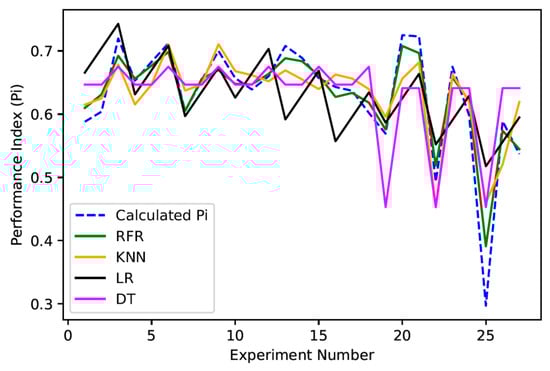 The performance of the RFR is compared against other ML models next. For this, four ML models are selected, namely, linear regression, K nearest neighbours (KNNs), and decision tree (DT) regression. It can be observed as listed in Table 10 that RFR outperformed other models significantly with respect to overall prediction accuracy for the current dataset. This can also be further referred to in Figure 7 where the Pi predictions from multiple models are plotted with respect to the experiment number. The trained RFR model can be utilized to have a relative performance measure of any parameter settings, from the basic understanding that the settings with larger Pi predictions would perform better than the ones with lower Pi predictions.