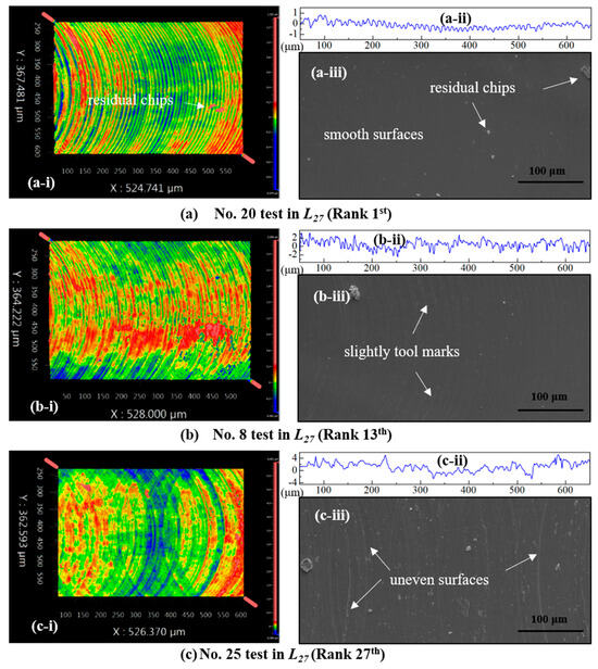 Figure 9a–c show the measured surface morphologies, surface contours, and the SEM images of the micro-milled grooves with the parameter settings of A3B1C2 (rank 1st), A1B3C2 (rank 13th), and A3B3C1 (rank 25th), respectively. One can see that, at the optimal cutting conditions (A3B1C2), there are clear and trim residual tool marks on the generated groove surfaces, as shown in Figure 9a, although a few residual chips have adhered on the machined surfaces; on the other hand, in the other cutting conditions, the tool marks are prone to severe fluctuations, as shown in Figure 9b,c, especially in the case of parameter settings ranked 25th. In addition, the groove surface in Figure 9a is much smoother than those in the other two cases. This scenario could be proved by the measured surface roughness; in other words, Ra = 0.248 μm in Figure 9a is only around one-third or one-quarter of those in Figure 9b,c.