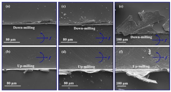 The burr morphologies generated in the down- and up-milling modes during micro-groove milling: (a,b) N = 25,000 rpm, ap = 0.05 mm, fz = 0.3 µm/tooth; (c,d) N = 5000 rpm, ap = 0.25 mm, fz = 0.3 µm/tooth; (e,f) N = 25,000 rpm, ap = 0.25 mm, fz = 0.1 µm/tooth.