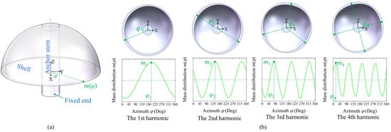 The structure of a hemispherical resonator is composed of a shell that generates standing wave vibrations and an anchor stem used for support and fixation to the carrier, as depicted in Figure 1. This anchor stem can be conceptualized as a cantilever beam that is fixed at one end and carries mass and load at the other. In an ideal hemispherical resonator, the vibrating mass should be uniformly distributed circumferentially around the shell, ensuring that the mass at any azimuthal position is identical, thereby maintaining the balance of the center of mass during resonance. However, due to the influence of manufacturing or material defects, the mass distribution is often non-uniform. To describe the complex array of mass defects, a mass ring model is established, wherein the mass distribution along the circumference is considered a continuous signal with a period of 2π. This continuous signal is expanded in the form of a Fourier series:
