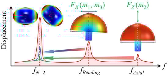 The radial eccentric forces generated by the 1st and 3rd harmonics of the mass distribution induce bending vibrations in the anchor stem. Concurrently, the 2nd harmonic induces axial forces and vibrations at the same frequency as the resonant standing wave, as illustrated in Figure 2. These two types of vibrations, acting as spurious modes, couple into the operating N = 2 wine-glass modes of the hemispherical resonator, leading to increased anchor loss in the resonator and adversely affecting the measurement and control of the gyroscope. Therefore, it is necessary to identify the harmonic information within the mass defects and to trim them to suppress their effects.