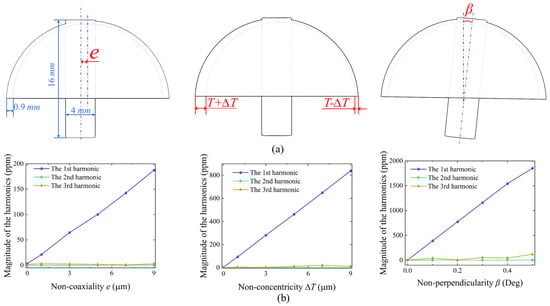 Initially, the harmonics of the mass distribution induced by common geometric structural errors in the hemispherical resonator are assessed using the identification methods for the first three harmonics. These errors encompass non-coaxiality e between the shell and the anchor stem, non-concentricity ∆T of the inner and outer circles of the shell, and non-perpendicularity β between the shell and the anchor stem, as illustrated in Figure 3a. Geometric models incorporating various structural errors are first established, and the harmonic components arising from these errors are evaluated using the finite element method. After importing the geometric models into the finite element simulation software, the material is set to silica glass, the base end of the anchor stem is constrained as fixed, and swept meshes are generated. The models are first run to compute the natural frequencies of the N = 2 wine-glass modes, followed by a frequency domain calculation where the resonator is excited into two degenerate states. From the dataset of the finite element calculations, vibration data at the top of the anchor stem and at various points on the rim of the shell are extracted, and the harmonics are calculated using the harmonic identification formulas for each order.