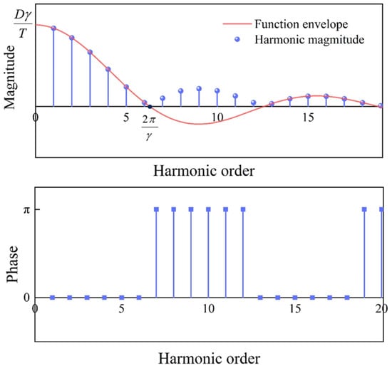 where , j denotes the imaginary unit, and n represents the harmonic order. Based on the properties of the sampling function Sa, the frequency spectrum Fn is plotted. Figure 5 illustrates the impact of the trimming parameters D and γ on the amplitudes of the various harmonics introduced by the etching groove, with D and γ values of 1 in the figure. The phases of the lower-order harmonics before the intersection of the envelope lines are all zero, meaning that when a rectangular pulse is introduced, its transformation into lower-order harmonics (orders less than 2π/γ) is oriented in the direction of the center’s azimuth of the etching groove.