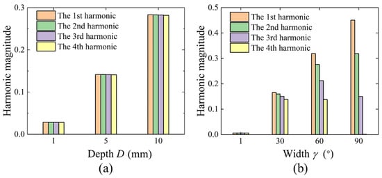 Relationship between the magnitudes of the first four harmonics and the trimming parameters D and γ. (a) When γ is set to 10°, the harmonic magnitudes vary with depth D. (b) When D is set to 1 mm, the harmonic magnitudes change with width γ.