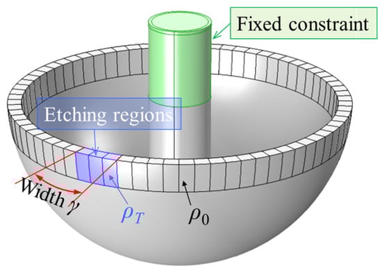 To verify the rectangular pulse parameter model for trimming, a geometric model and simulation procedure are established to simulate the effects of the trimming parameters D and γ on the trimming process. Initially, an ideal hemispherical resonator model is constructed, with its shell rim section evenly divided into 72 segments along the circumferential direction as in Figure 7 and imported into finite element analysis software. The model is initialized with silica glass material, characterized by a material density ρ0 of 2203 kg/m³. A number of these segments on the shell rim are designated as the simulated etching regions, and the material density of these areas is assigned as follows: