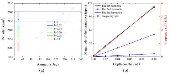 Initially, the sector spanning 20 to 25 degrees is designated as the simulated etching region. With an etching width of 5 degrees, an increase in the depth coefficient results in a corresponding decrease in the density of the etching region, thereby simulating the state of material removal and mass reduction. The density distribution at different depth coefficients k is shown in Figure 8a, simulated for different depths D of the rectangular pulse model. The simulation program is then executed to calculate the natural frequencies of the N = 2 wine-glass modes, from which the frequency split is determined. Subsequently, frequency domain calculations for two degenerate modes are conducted, and data from the top of the anchor stem and the shell rim are extracted and substituted into the harmonic identification formulas to compute the harmonics of each order. The simulation results, as depicted in Figure 8b, show that the identified first three harmonics and frequency split linearly increase with the augmentation of the depth coefficient k, a pattern consistent with the variation in density.