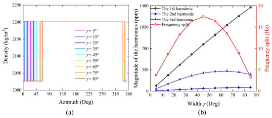 With a depth coefficient k of 0.008, the trimming density distribution for different etching region widths is compared in Figure 9a, simulated for different widths γ of the rectangular pulse function model. After running the simulation, the frequency split and each harmonic order are calculated using the same procedure. The results in Figure 9b indicate that as the trimming width increases, the 1st harmonic essentially increases proportionally, and the gradient of the resulting harmonics also increases accordingly. The identified 1st harmonic increases almost linearly with the increase in the width of the etching regions; however, due to the increase in harmonic gradient, the 2nd and 3rd harmonics and the frequency split no longer vary linearly with the width. As the width of the etching regions exceed 45 degrees, the introduced frequency split gradually decreases. The finite element simulation results validate the trimming parameter model based on the mass distribution function and spectral analysis.
