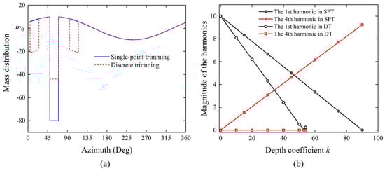 Comparison of single point trimming (SPT) and discrete trimming (DT) methods. (a) Comparison of mass distribution functions. (b) Variation of 1st and 4th harmonic amplitude values with depth coefficient k in both schemes.