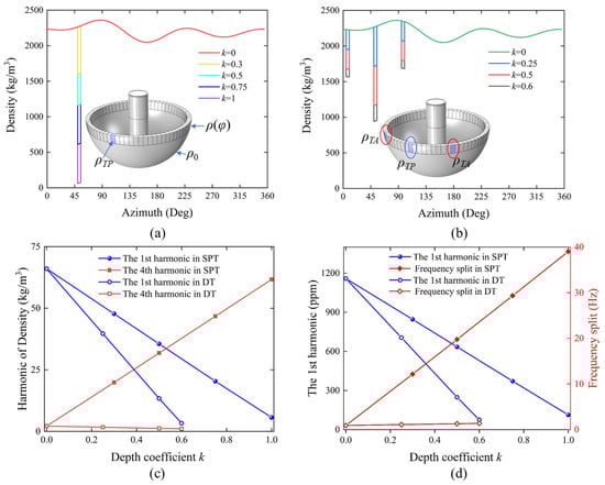 Finite element simulation of SPT and DT. (a) Circumferential density distribution function of the resonator model in the SPT scheme. (b) Circumferential density distribution function of the resonator model in the DT scheme. (c) Variation of harmonics derived from density distribution for both schemes with respect to the depth coefficient k. (d) Variation of the identified 1st harmonic and frequency split for both schemes with respect to the depth coefficient k.