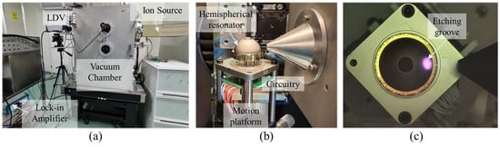 As depicted in Figure 12, an integrated experimental platform for harmonic identification and trimming of hemispherical resonators has been established. This experimental platform primarily comprises the following modules: a motion platform, a Laser Doppler Vibrometer (LDV), a lock-in amplifier, an ion beam system, and a vacuum chamber. The motion platform, which includes a motor, grating, rotary table, translation stage, and elevation stage, facilitates three-axis translational and rotational movements to adjust the position and attitude of the resonator sample. The LDV and lock-in amplifier are utilized for modal testing and vibration data acquisition. The ion beam system enables continuous etching of the resonator’s surface to remove material for harmonic trimming. The controllable atmospheric pressure within the vacuum chamber provides a suitable operating environment for both the resonator and the ion beam system.