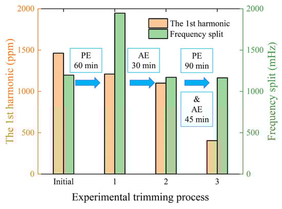 The DT scheme, consisting of PE and AE steps, is first validated on a sample hemispherical resonator, with the results depicted in Figure 13. Following the initial identification of the 1st harmonic and frequency split, a PE groove is created by etching for 60 min at the azimuth φ1 corresponding to the 1st harmonic. After the primary etching, the 1st harmonic is reduced from 1462 ppm to 1210 ppm, a decrease of 17.2%. However, the frequency split increased by 62.7% from 1196.1 mHz to 1946 mHz. With the ion beam diameter maintained constant, two AE grooves are formed by etching for 30 min on both sides at 45 degrees. This results in a slight reduction of the 1st harmonic from 1210 ppm to 1100 ppm, while the frequency split is reduced from 1946 mHz to 1170 mHz, nearly returning to the initial frequency split. This demonstrates that the AE grooves could suppress frequency split by compensating for the 4th harmonic. Subsequently, a complete DT process is conducted, with the PE groove etched for 90 min and the AE grooves etched for 45 min each. After this process, the 1st harmonic is further reduced to 404.3 ppm, and the frequency split remained almost unchanged at 1164 mHz. This outcome illustrates that the DT approach can effectively reduce the 1st harmonic without introducing the 4th harmonic, thus preventing drastic changes in frequency split.