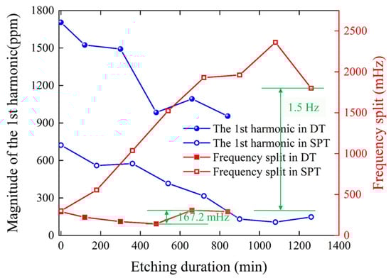 A DT experiment is also conducted on another resonator sample, and the changes in the 1st harmonic and frequency split during the etching process are compared with the results of the SPT experiment from previous work [34], as shown in Figure 14. In the figure, for DT, each step of trimming includes the total etching time for both the PE and AE grooves. After the SPT process, the 1st harmonic decreases from 723 ppm to 147.6 ppm, a reduction of 575.4 ppm. However, the frequency split sees a sharp increase from 0.3 Hz to 1.8 Hz. In contrast, the DT method, which lasted for 840 min, successfully reduces the 1st harmonic by 750 ppm. Throughout the process, the frequency split exhibits minimal fluctuations, with the maximum deviation reaching only 167.2 mHz, which is approximately 11% of the frequency split variation observed in the SPT scheme. The comparison results demonstrate that DT can achieve decoupling of the 1st and 4th harmonics, which is beneficial for optimizing the mass balance of hemispherical resonators.