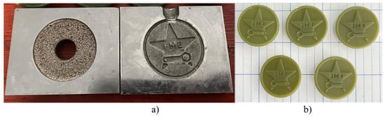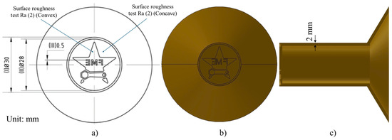 Figure 2 shows the electrode pattern production process using 3D SLA printing. After 3D design, the file was converted to the .stl file format. Then, the electrode patterns were printed using a Zongheng SLA-600 printer (ZONGHENG3D company, Xiangzhou District, Zhuhai, China) with ultraviolet rays, a wavelength of 355 nm, and a power source of 3 W, as illustrated in Figure 2a. The electrode patterns were printed with a layer resolution of 0.1 mm, the 3D part inclined at 45° with support, and a pattern thickness of 2.0 mm, using epoxy resin HONY-01 (Zongheng Additive Intelligent Technology Co., Ltd., Zhuhai, China), as shown in Figure 2b. The printing parameters and orientation were configured to ensure a distinct logo surface and minimal roughness, as shown in Figure 2c. The patterns were fabricated under identical conditions and in a single print batch, as shown in Figure 2d. After printing, as shown in Figure 2e, the printed electrode patterns underwent UV curing to achieve complete resin solidification. Figure 2f shows the final 3D-printed electrodes used for the investment casting process.