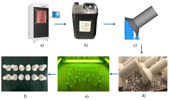 Prototyping process using SLA 3D printing method: (a) Zongheng SLA-600 3D printer, (b) epoxy HONY-01 resin, (c) pattern support structures, (d) pattern during the 3D printing process, (e) UV curing, and (f) final 3D printed pattern.