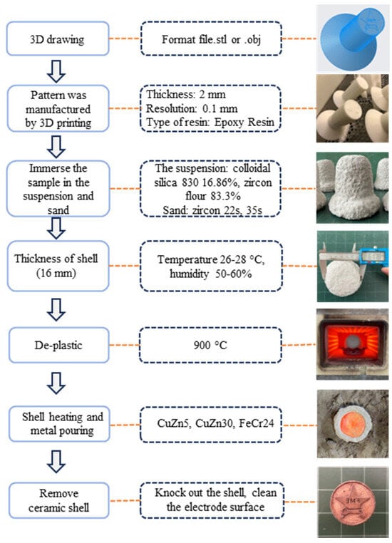 The fabrication of electrodes utilizing the investment casting method was performed in a sequence of steps, as illustrated in Figure 3. Initially, the 3D printed pattern was immersed in a slurry composed of 18.67% silica 830 and 83.33% zircon flour, followed by the application of a 22–35s sand coating and subsequent drying at a temperature range of 26–28 °C and a humidity range of 50–60% for 24 h. The immersion and coating technique was continued until the mold shell reached the appropriate thickness. The polymer was then degraded, and the mold was sintered at 900 °C to form the ceramic shell. Next, CuZn5, CuZn30, and FeCr24 alloys were poured into the mold. Finally, the shell was destroyed, and the surface was cleaned to reveal the final electrodes.
