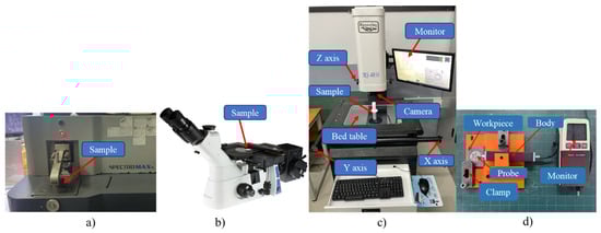 Equipment for the experiment: (a) OES analyzer SPECTROMAXx, (b) Euromex OX.2653-PLM microscope, (c) manual vision measuring machine MS-4030 VMM, (d) roughness tester Mitutoyo SJ-201.