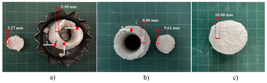 After ceramic coating, the patterns underwent a degradation phase in a furnace, with temperature gradients ranging from 30 to 900 °C. In the case of the 5.3 mm thickness, a fracture was observed at 200 °C during the degradation phase. The ceramic shell, which was 8.80 mm thick, also exhibited cracking at 400 °C. The observed fractures are attributed to stress concentration at the corners and edges of the ceramic shell, as evidenced in Points 1, 2, and 3 in Figure 6a and Point 4 in Figure 6b. Notably, the 16.0 mm thick ceramic shell remained intact throughout the degradation process, as depicted in Figure 6c. The fracture regions in the 5.3 mm thick shell are measured at 3.27 mm, while those in the 8.8 mm thick shell are measured at 5.62 mm, indicating a thickness reduction of 36.1–38.3% compared to the non-fractured regions. The reduced surface area decreases volume density at the corners/edges, thereby exacerbating crack propagation at stress concentration [18,29]. Furthermore, considerable differences in the coefficient of thermal expansion (CTE) between the pattern material (epoxy resin) and the ceramic shell (SiO2) are also the reason for the fracture. SiO2 has a CTE of 0.6 × 10−6 K−1, while epoxy resin has a CTE of 59.9 × 10−6 K−1, almost 200 times higher [21,22,34]. The CTE mismatch between pattern and shell materials induces stress exceeding the shell’s fracture modulus [19,20,21,22]. Experimentally, increased shell thickness demonstrably enhances fracture resistance [13]. Besides increasing the thickness of the shell to enhance mold strength, the mold’s durability can also be improved by altering the material composition, adding reinforcing fibers, etc. [35,36].