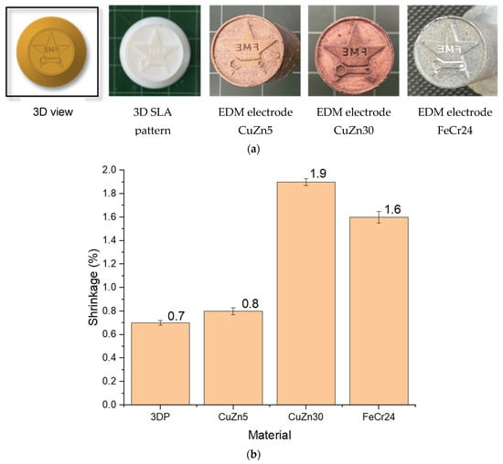 Figure 7a shows the electrode model, 3D SLA pattern, and the IC electrodes from CuZn5, CuZn30, and FeCr24. The dimension shrinkage of the 3D-printed patterns and cast specimens is illustrated in Figure 7b. The results reveal that the dimensional shrinkage of the 3DP patterns, CuZn5, CuZn30, and FeCr24, is 0.7%, 0.8%, 1.9%, and 1.6%, respectively. The RP pattern dimensions are consistently smaller than the nominal dimensions, within a range of 0.7%. The disparity between the RP pattern and nominal dimensions is attributed to the inherent shrinkage of the epoxy resin material during the 3D SLA printing process [37,38,39]. This result is consistent with prior research, which has reported shrinkage values ranging from 0.008 to 3.67% [11] and 0.183 to 0.50% [12]. The reason is the resolution limitations of the continuously stacked material layers, leading to dimensional variations (the printing resolution of the Zongheng SLA-600 apparatus is 0.1 mm). Moreover, phase transformations such as gelation, vitrification, and layer-by-layer solidification’s cumulative effect over time result in volumetric shrinkage [40]. Thermal fluctuations during 3D printing also contribute to volumetric shrinkage [39]. This contraction requires pre-compensation to assure the accuracy of the final IC electrodes. Besides 3DP pattern shrinkage, the shrinkage value also presents alloy shrinkage during solidification [41]. The castings exhibit shrinkage compared to the initial nominal dimensions due to metals contracting when solidified, reducing volume. Moreover, different casting methods could also lead to different shrinkage rates [42,43,44]. Specifically, CuZn5 shrinks by 0.8%, CuZn30 shrinks by 1.9%, and FeCr24 shrinks by 1.6%. Because the freezing range of CuZn5 is shorter than CuZn30 [45,46]. This shrinkage result is consistent with the Machuta et al. study [47].