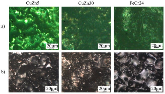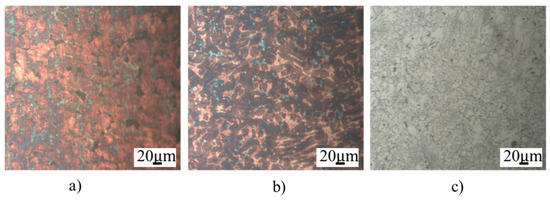 Microstructure of different IC electrodes: (a) CuZn5, (b) CuZn30, and (c) FeCr24.