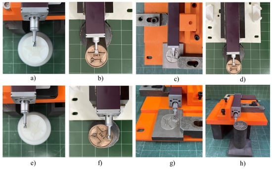 Surface roughness test: (a) 3DP model, (b) cast specimen, (c) EDM machined workpiece, and (d) EDM machined electrode at the Ra (1) position; (e) correspond to the 3DP model, (f) cast specimen, (g) EDM machined workpiece, and (h) EDM machined electrode at Ra (2) position.