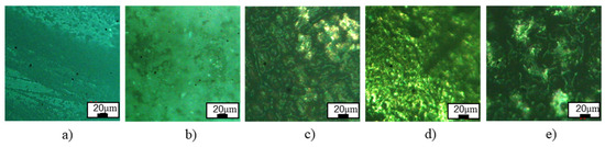 Microscopic inspection of the sample surface: (a) 3D pattern, (b) shell mold, (c) CuZn5 electrode, (d) CuZn30 electrode, (e) FeCr24 electrode.