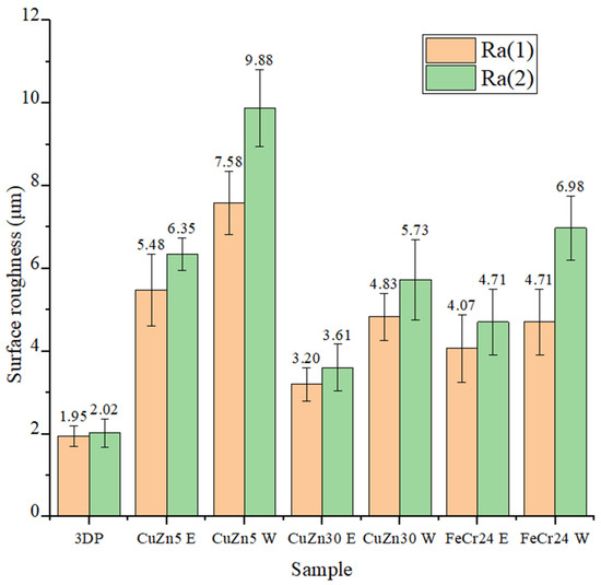 Figure 12 depicts an analysis of surface roughness measurements. The cast specimens have higher surface roughness than the 3D-printed models. Moreover, the surface roughness of the EDM workpieces is always higher than that of the related electrode. The surface roughness varies between places, with position 2 having more roughness than location 1. The electrode roughness values at the Ra1 position are 5.48 µm, 3.2 µm, and 4.07 µm, corresponding to the electrode materials CuZn5, CuZn30, and FeCr24. The CuZn30 electrode has the lowest surface roughness, while the CuZn5 electrode has the highest. In addition, the surface finish of the investment cast product is determined by the surface finish of the 3D-printed model and the internal surface finish of the ceramic shell. The roughness of the material surfaces increases gradually from the 3D-printed model manufacturing to mold shell formation and investment casting.