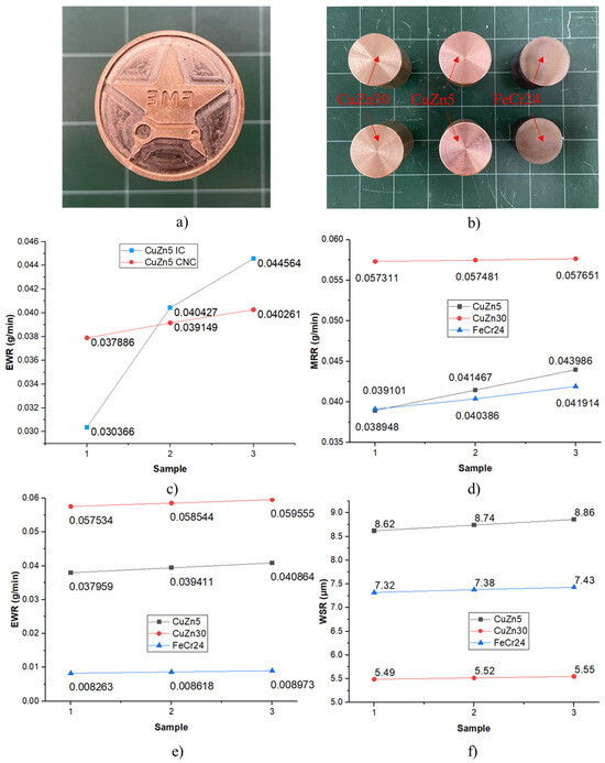 Figure 14a,c show the CNC electrode and the result of EWR for both electrode types, CuZn5 IC and CuZn5 CNC, during the EDM process under the same conditions (I = 5 A, Ton = 120 µs, Toff = 60 µs). As shown in Figure 14c, the EWR value of the CuZn5 IC is lower than that of CuZn5 CNC in the first sample and then higher. The difference in electrode wear rate, despite the electrodes being of the same CuZn5 material, is due to the initial surface roughness of the electrodes. Research by Hadad et al. [50] indicates that an electrode with a higher initial surface roughness will experience a greater electrode wear rate under the same EDM machining conditions. The CuZn5 CNC electrode, which has many material peaks, will quickly reach the maximum number of peaks and have an effective spark discharge area during EDM machining. In contrast, the CuZn5 IC electrode, due to its high surface roughness, will have a lower number of material peaks. However, the volume of these peaks is larger than the peak volume of the CuZn5 CNC electrode, so the time to reach the maximum number of peaks and an effective spark discharge area will be longer, resulting in a higher EWR compared to the CuZn5 CNC electrode.