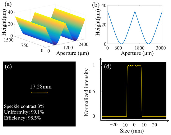 The design results regarding the continuous-surface DOE for linear beam shaping are shown in Figure 1. The period of the DOE is 1536 μm. Figure 1a displays the distribution of the DOE structure. Figure 1b shows the cross-section of the DOE structure: evidently, the profile is smooth, showing no abrupt changes. Figure 1c presents the reshaped beam, along with the linear distribution. Figure 1d shows the cross-section of the intensity. Evidently, the intensity distribution is very uniform, and the speckle contrast, uniformity, and diffraction efficiency were determined to be 3%, 99.1%, and 98.5%, respectively.