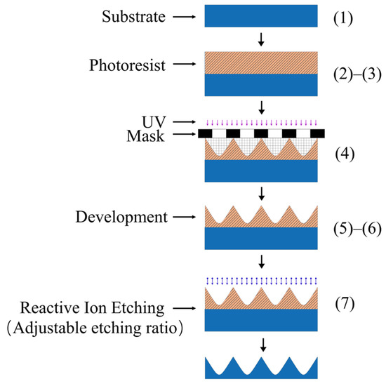 A continuous-surface DOE was fabricated through a combination of photolithography and reactive ion etching (RIE) methods. The main steps in the preparation process included (1) substrate cleaning, (2) photoresist coating, (3) pre-baking, (4) lithography, (5) development, (6) post-baking, and (7) etching. [20]. The process flow for these main steps is shown in Figure 3. The pattern on the photomask is transferred to the photoresist through exposure. Then, the structure of the photoresist is etched and transferred to a fused silica substrate through RIE. By adjusting the etching gas ratio (SF6 and CHF3) during RIE, the etching ratio between the photoresist and quartz substrate can be controlled precisely. In general, a maximum etching ratio of 1:2 can be achieved, indicating that the substrate material can achieve an etching depth twice that of the photoresist layer. Therefore, the depth of the structure on the photoresist can be appropriately reduced during photolithography, making profile accuracy easier to control.