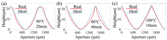 The surface profiles of the photoresists fabricated under the three different pre-baking conditions were measured, as shown in Figure 4. The pre-baking conditions mainly affected the adjacent regions of the periodic structure. When the pre-baking temperature and time were 100 °C and 10 min, respectively, the surface profile was clearly closest to the ideal surface profile. Therefore, for this continuous-surface DOE, the high-temperature, short-duration pre-baking method was used in the subsequent steps.