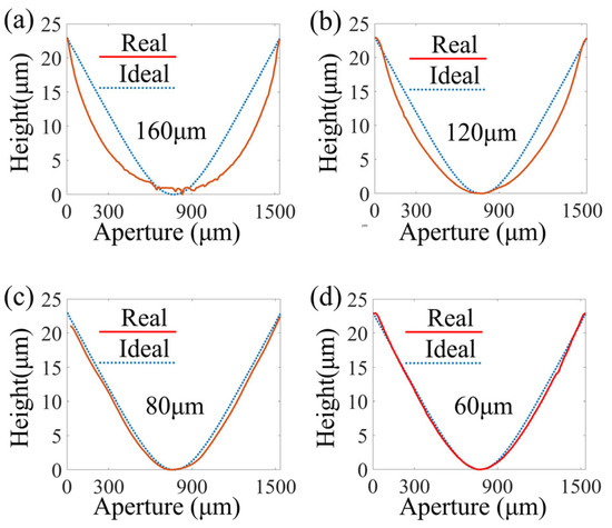 In the process of lithography, because of the creation of a certain gap between the substrate and mask, the effect of this gap on the profile of the DOE needs to be considered. According to the findings in Section 3.1, the high-temperature, short-duration pre-baking settings of 100 °C and 10 min were used to pre-bake the spin-coated photoresist. The exposure gaps were set to 160 μm, 120 μm, 80 μm, and 60 μm, and the subsequent development and post-baking conditions were the same as those used in Section 3.1. The surface profiles of the materials fabricated under the different exposure gaps were measured, as shown in Figure 5. Evidently, the exposure gap mainly affected the curvature of the surface profile. The greater the gap, the greater the distortion of the surface profile of the structure. When the gap was set to 60 μm, the actual surface profile was basically the same as the ideal surface profile. Therefore, the gap was set to 60 μm in the following experiments.