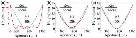 Fabrication with different developer concentrations and times: (a) a ratio of developer to deionized water of 2:3 and a development duration of 100 s, (b) a ratio of 1:1 and a development duration of 120 s, and (c) a ratio of 3:7 and a development duration of 150 s.