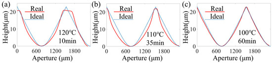 In order to improve the photoresist’s resistance to etching, post-baking after development had to be performed. The influence of different post-baking process parameters on the surface profile was analyzed. The pre-baking temperature and time were set to 100 °C and 10 min, respectively. The exposure gap, ratio of developer to deionized water, and development time were set to 60 μm, 3:7, and 150 s, respectively. The post-baking temperature was set to 120 °C, 110 °C, and 100 °C, and the corresponding time was set to 10 min, 35 min, and 60 min, respectively. The surface profiles measured at different post-baking temperatures and times are shown in Figure 7. When post-baked at 100 °C for 60 min, the corresponding surface profile of the photoresist clearly shows minimal distortion. Therefore, low-temperature, long-duration baking should be used in the post-baking stage.